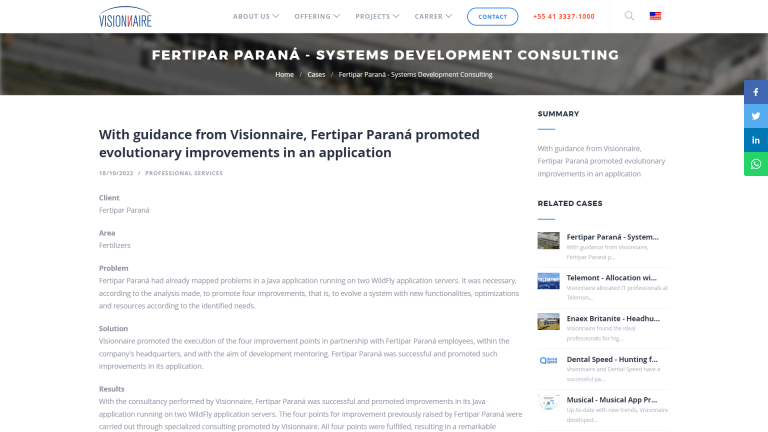 Visionnaire promoted the execution of the four improvement points in partnership with Fertipar Paraná employees, within the company's headquarters, and with the aim of development mentoring. With the consultancy performed by Visionnaire, Fertipar Paraná was successful and promoted improvements in its Java application running on two WildFly application servers.